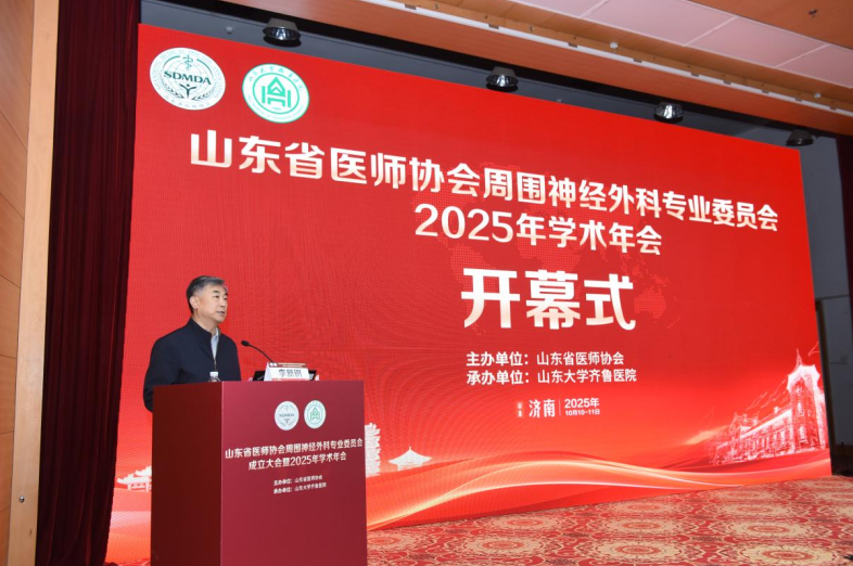 11日上午,山东省医师协会周围神经外科专业委员会2025年学术年会正式开幕。中国医师协会副会长、山东省医师协会会长孙洪军,专委会名誉主任委员、山东大学齐鲁医院神经外科学科带头人、山东大学脑与类脑科学研究院院长李新钢,山东大学齐鲁医院党委书记陈鑫,山东第一医科大学副校长辛涛,专委会主任委员王新宇教授出席会议并分别致辞。开幕式由专委会副主任委员、山东大学齐鲁医院神经外科杨宁教授主持。