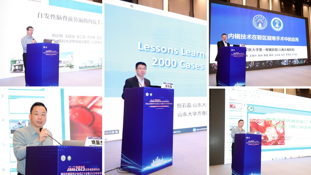 本次学术年会聚焦神经内镜技术在颅底、垂体、脑血管等复杂疾病中的难点突破与创新应用,特邀24位国内外知名专家开展专题授课,现场学术氛围浓厚,交流热烈。中国医师协会副会长、山东省医师协会孙洪军会长作主旨发言《医务管理者和医务人员素养的提高》,从宏观层面阐述了医务工作者人文素养的重要性;来自日本大阪公立大学的後藤剛夫教授分享了《颅底肿瘤的微创内镜手术入路》的精彩报告,为会议注入了前沿的国际视角;首都医科大学附属北京天坛医院桂松柏教授《幼儿和儿童颅咽管瘤的内镜经鼻手术治疗》、东部战区总医院马驰原教授《内镜经腹侧自然腔隙切除颅底病变》等报告,深入探讨了特定疾病领域的内镜解决方案;北京协和医院姚勇教授《协和垂体疾病的MDT诊疗》凸显了多学科协作的核心价值;首都医科大学宣武医院李茗初教授《内镜经口入路解剖和手术》与解放军第九六〇医院朱伟杰教授《3D内外镜下动脉瘤夹闭、肿瘤切除、MVD及颅颈交界区手术》的分享,充分展示了神经内镜技术在拓展手术边界、提升手术精度方面的巨大潜力。