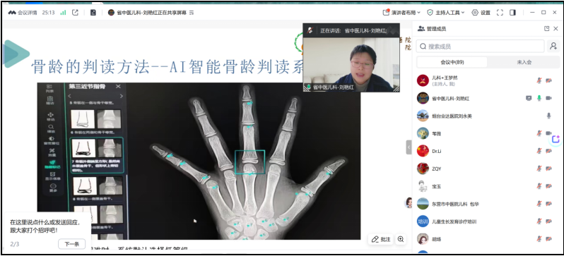 学术交流环节,山东中医药大学附属医院儿科刘艳红副主任讲解了骨龄的简易判读,通过讲解,学员们了解到骨龄是反映儿童生物学成熟度的可靠指标,比实际年龄更能准确体现个体的生长发育水平和成熟趋势。骨龄判读是一项极其重要但这项临床辅助工具又并非完美,其价值需依赖于判读者的专业水平和正确的临床解读。