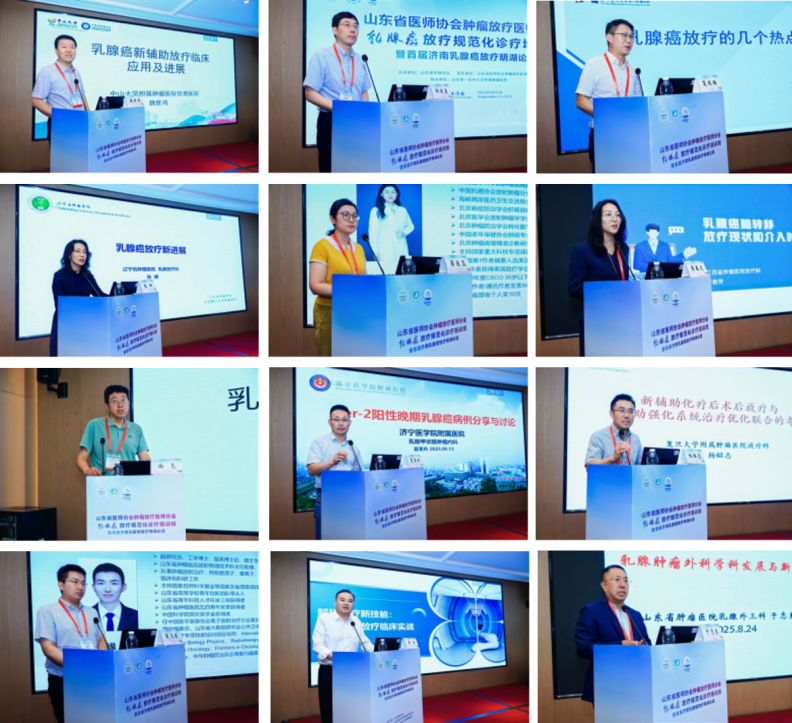 学术交流环节,中国医学科学院肿瘤医院翟医蕊教授、江西省肿瘤医院蒋春灵教授、哈尔滨医科大学附属肿瘤医院许庆勇教授、云南省肿瘤医院(昆明医科大学第三附属医院)夏耀雄教授、甘肃省肿瘤医院魏世鸿教授、辽宁省肿瘤医院张娜教授、复旦大学附属肿瘤医院杨昭志教授、济宁医学院附属医院夏重升教授就“乳腺癌重建术后放疗决策和实践”“乳腺癌脑转移放疗进展和介入时机”“乳腺癌改良根治术后靶区勾画”“乳腺癌放射治疗的几个热点话题”“乳腺癌放疗新进展”“乳腺癌新辅助化疗后辅助强化与放疗时机考量”“乳腺癌病例”进了专题讲座;山东第一医科大学附属肿瘤医院徐亮教授、于志勇教授、戴天缘教授、黄伟教授就“乳腺癌影像”“乳腺区域外科的热点问题拓展与挑战”“乳腺癌质子放疗”“解锁放疗新技能-空间分割放疗临床实战”作专题报告。